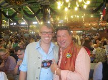 Ursprünglich wollten wir uns im Franziskaner auf ein Weißwurstfrühstück treffen – aber auf Grund der Wetterlage (der Himmel weint Freudentränen – endlich hat das Warten auf’s Paradies wieder ein Ende – immer schön positiv bleiben…) haben wir den Treffpunkt gleich in die Box 7 Augustiner Festhalle (mein ‚Meldezettel‘ für die nächsten 16 Tage) verlegt. Wir (Gerhard & Mira – heuer erstmals als Ehepaar auf der Wiesn, Markus, Gersti und Sascha) waren schon um 10.30 Uhr vor Ort und hatten somit mal richtig Zeit uns mit ‚unseren‘ Wiesn-Mamis – die sich die nächsten zwei Wochen um unser leibliches Wohl kümmern werden, ausgiebig zu plaudern. Erster Fan-Besuch Flocki aus Braunschweig dann folgte Besuch aus der Heimat Roman & Bianca, Abordnung der Feuerwehr und Rettung Tulln. Ganz besonders gefreut hab ich mich über das Wiedersehen mit Gerli (der Mann der mich vor 29 Jahren das erste Mal mit auf die Wiesn nahm….der Rest ist mittlerweile Geschichte J ). Auch das Wiedersehen mit den Freunden aus dem Weinzelt war sehr erfreulich – alle wieder wohlbehalten im Paradies: die Sumpfkröten, die Blechblos‘n, die Kellner Crew… bereits traditionsgemäß durfte ich beim Fliegerlied wieder mit meinen Freunden der Blechblos’n auf der Bühne performen – ja ‚er‘ fliegt heuer wieder! Bei Manuela und Claudia gab’s heute eine doppelte Portion Chili im Leberkäs und nach Rückkehr ins Weinzelt traf ich meine Freundin Moni Gruber in der Hausbox!