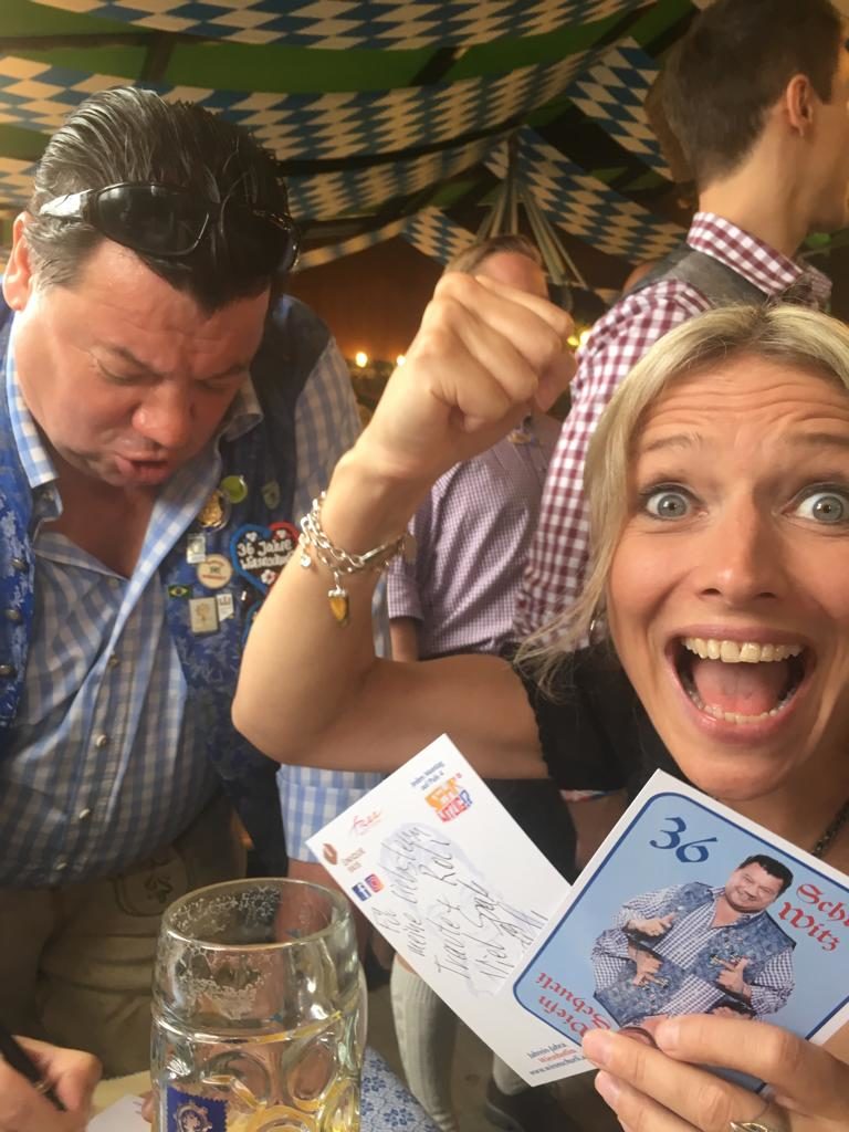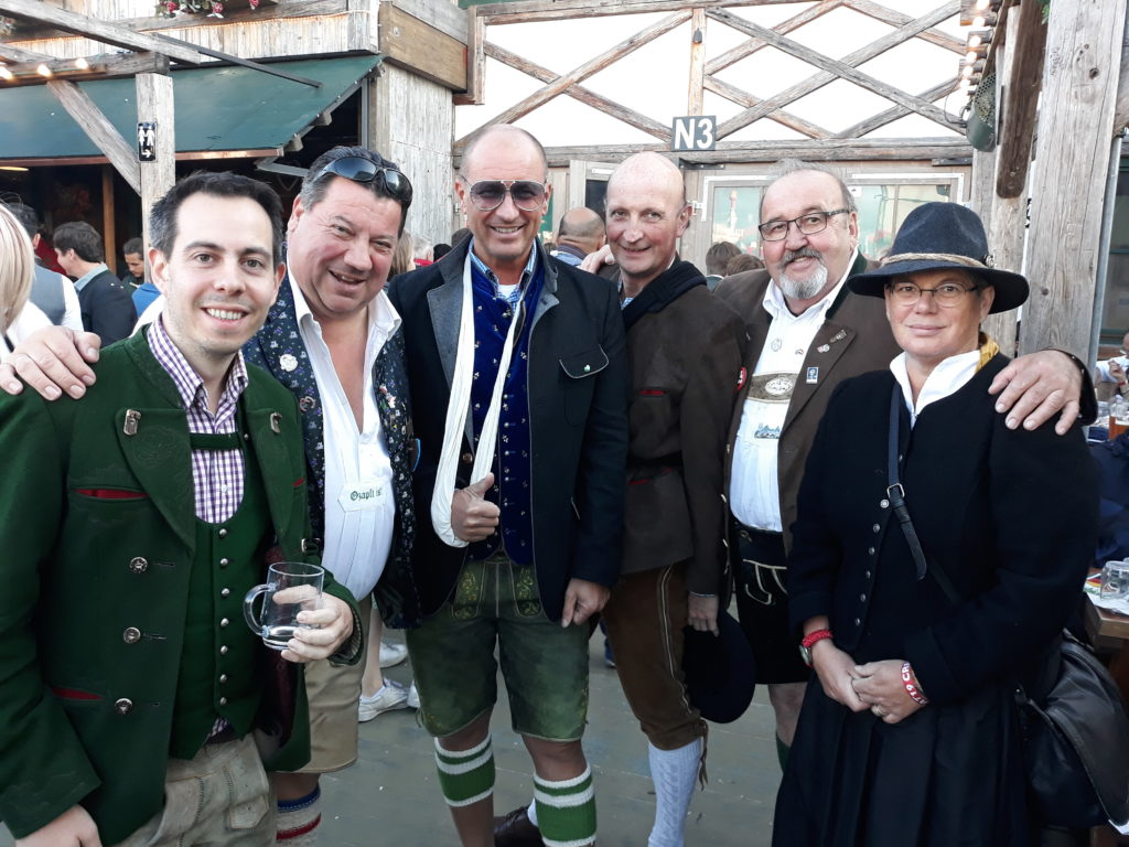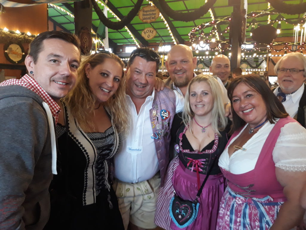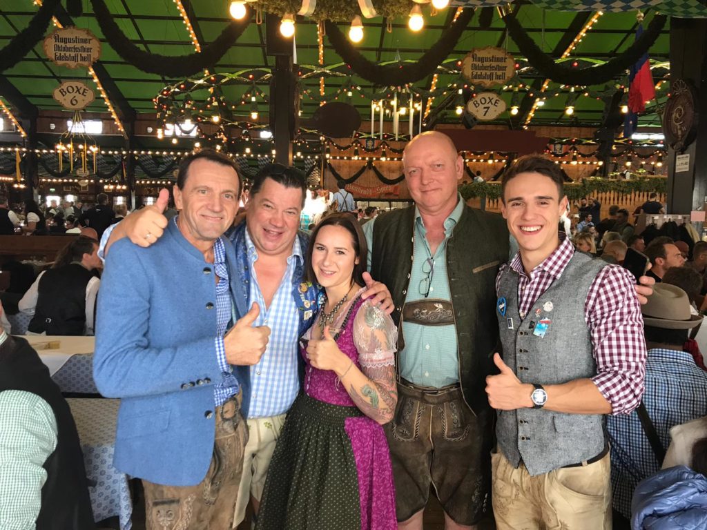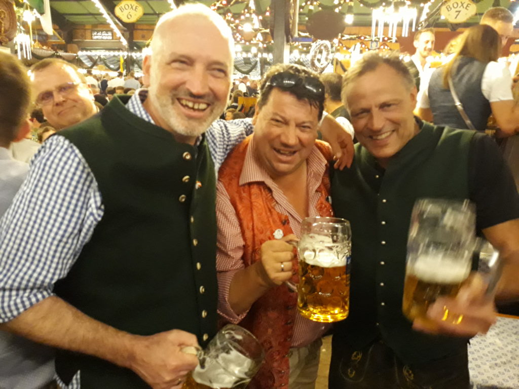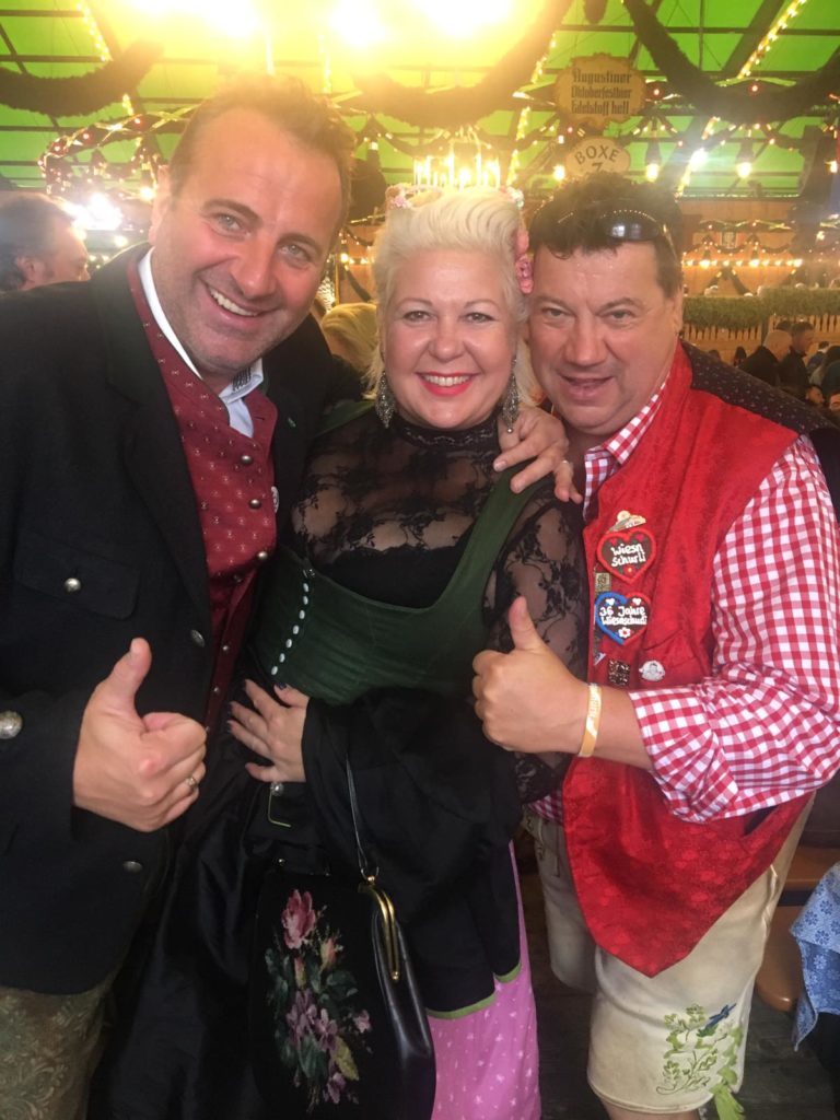 Grande Finale! Da darf natürlich mein Freund Cristian Macedonschi nicht fehlen! Er hat nach der Sicht hinter die Kulissen – sogar einen original Holzschlägel zum Anzapfen für nächstes Jahr in Rumänien erhalten! Auch mein Freund Dieter ist zum Wiesnende nochmals eingeflogen! Aufgrund des nicht so berauschenden Wetters ist die Box7 sehr gut gefüllt (Gerhard, Mira, Felix, Gersti, Andi, Tom, MO-Boys, Roli, Traute, Wilma, Norbert, Matthias, Manuel uvm.) Mittags gönn ich mir beim Heimer noch eine Abschiedsente mit Rotkraut und Knödel, danach treff ich meine Freundin Moni Gruber samt Familie im Augustiner, bei einem ‚Maßerl‘ blödeln wir was das Zeug hält!