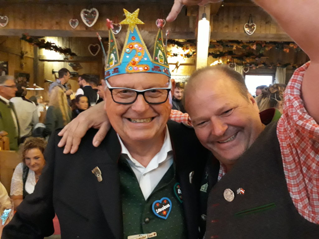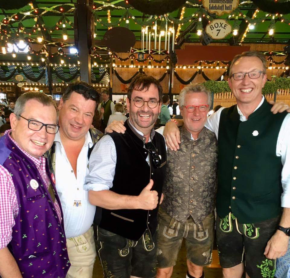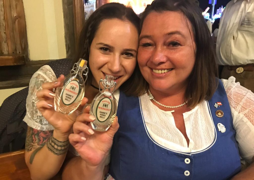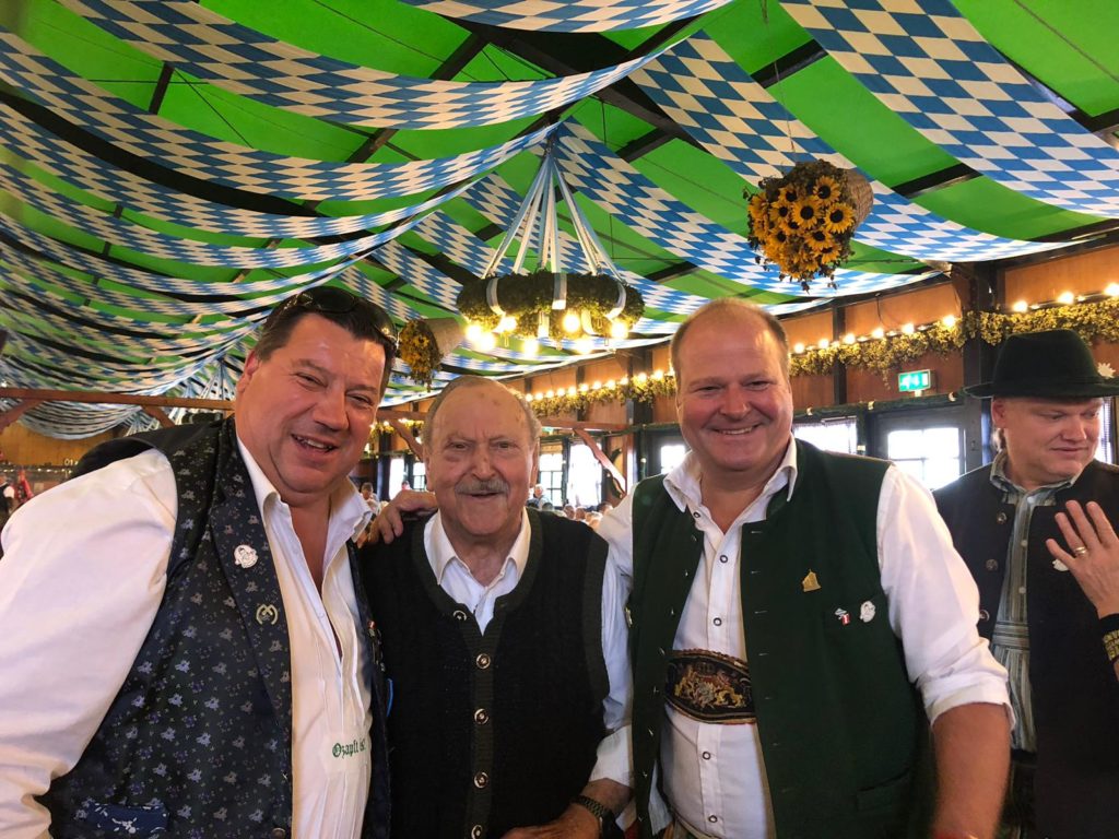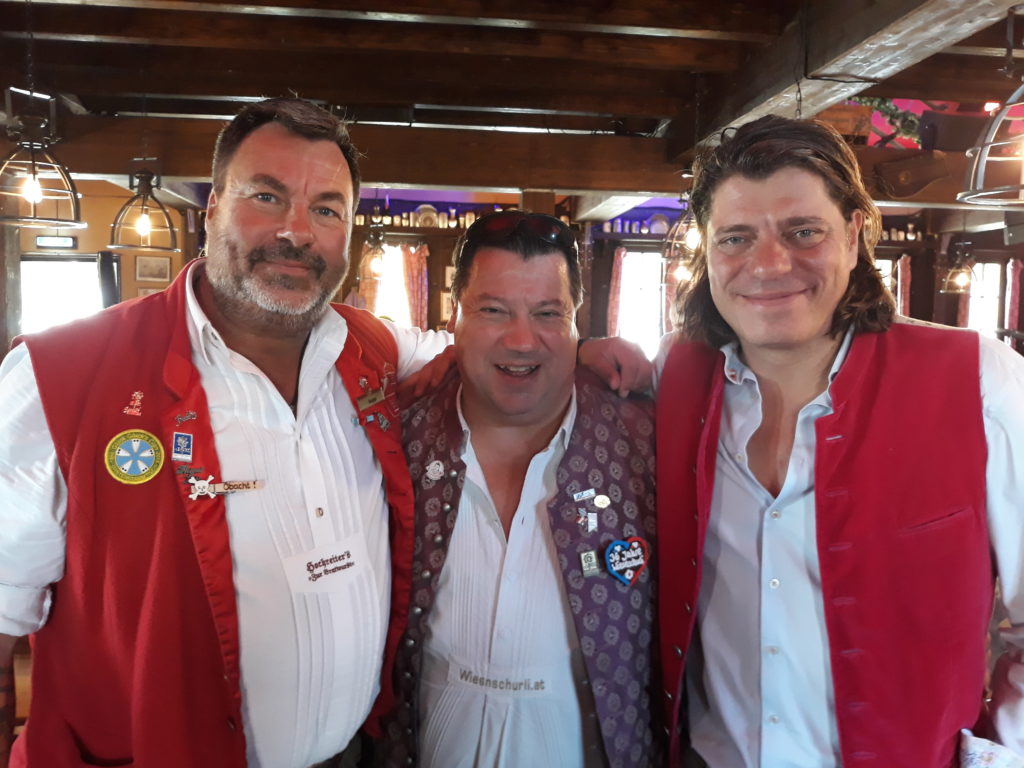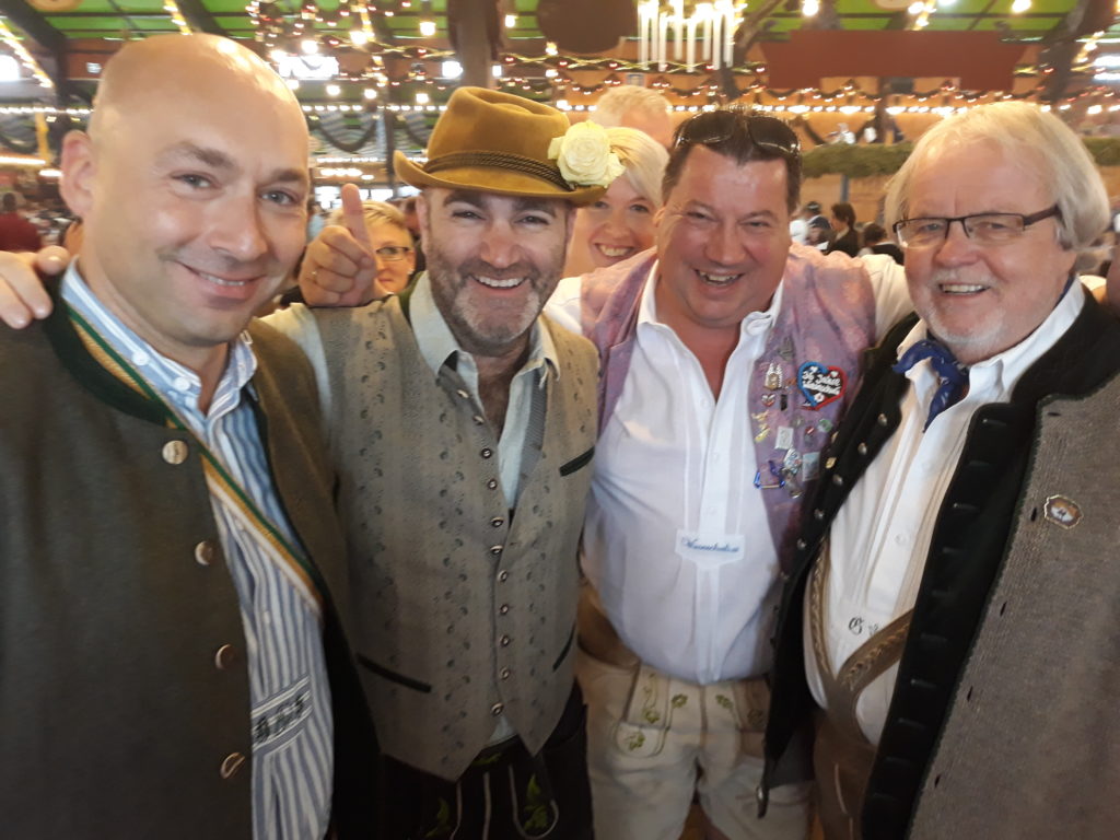 Weiter geht die Abschiedstour in der Bratwurst – Abschiedsspritzer mit Karli, Olaf, Thorsten und Rüdiger, da es leider wieder zu regnen beginnt – wechsel ich ins Weinzelt. Gestern hab ich zum allgemeinen Prostspenden aufgerufen – ich geh nun mit gutem Beispiel voran! Gerhard hat bei Luke für uns zwei Boxen vor der Bühne klar gemacht und jetzt ist Party! Die Starterlaubnis am letzten Wiesntag 2019 ist erteilt, Mira und Anna sind heute meine bezaubernden Stewardessen beim Fliegerlied. Runter von der Bühne – habe ich eine Begegnung der dritten Art….ich trage ein maßgefertigtes Gilet (Stoff in Wien gekauft) ein junger Mann springt mich an und freut sich, dass er das gleiche Gilet wie ich trägt!!! Er ist Tiroler und seine Mutter hat den Stoff ebenfalls bei einem Wien besuch gekauft – und ihm daraus das Kleidungsstück gefertigt! Zeit zum Finale wieder ins Wohnzimmer zu wechseln. Ich freue mich auf ein Wiedersehen mit Karin und Prem gemeinsam halten wir die Sternderlspritzer zum Augustiner Lied in die Höhe…jetzt kehrt Wehmut ein. Das Gefühl darf aber nicht zu lange dauern – denn das wirkliche Finale Wiesn 2019 findet im Weinzelt statt. Die MO-Boys laden mich zum ‚letzten Abendmahl‘ eine Box weiter feiert Immo Roland und freu mich ihn hier zu treffen. Weinzelt Wirt Stefan greift bei Högls Fun Band wieder zum Mikro und gibt ein Lied zum Besten, ich dreh nun meine Abschiedsrunde um allen Auf Wiedersehen zu sagen und freue mich in 348 Tagen wieder hier zu sein!
