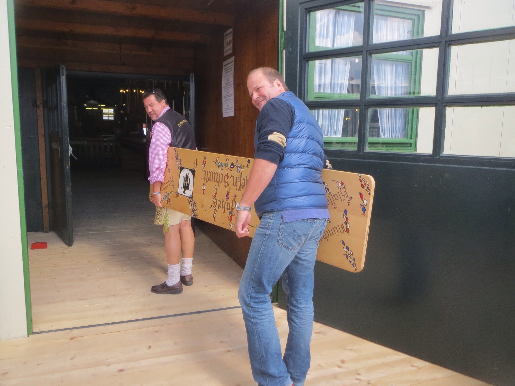 Los geht’s!Gestern haben wir noch den schönsten Abschied des Jahres beim Heurigen Schmuckenschlager zelebriert und heute geht’s schon Richtung Paradies. Meine Schwester Barbara und ihr Mann Ali haben mich heute chauffiert. Mit an Board war noch das Geburtstagsgeschenk meiner Freunde, welches ich auf der MS Stadt Wien zu meinem 30jährigen Wiesnschurli-Jubiläum überreicht bekam. Der Wiesnschurli-Faß-Tisch!Dieser erwartet mich und meine Gäste heuer im schönsten Gast-Garten auf der Wiesn. Dank Werner Hochreiter – Wiesnwirt Zur Bratwurst – darf mein Geschenk heuer auch auf die Wiesn. Auch der klassische Wiesnschurli Tisch (Gemeinschaftsgeschenk zu 25 Jahre Wiesnschurli) hat seinen Platz in der Box 7 eingenommen.Wir haben einen wunderbaren Tag in München verbracht und am Abend im Kytero trafen wir noch auf’s Sonnbühel Team und hatten a Mords Gaudi bei unserem persönlichen Wiesn Warm up.