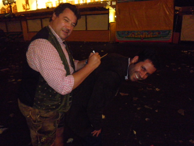 Am Kaiserfest in Bad Ischl hab ich den Markus Eberharter kennen gelernt und ihm zugesagt, wenn er auf der Wiesn ist, soll er sich bei mir melden – und ich ermöglich ihm den Einlass Abends im Weinzelt – was ich auch tat. Ein Wiesnschurli ein Wort – davon konnte sich Markus heute überzeugen J naja wie’s weitergeht – könnt ihr euch sicher schon denken: richtig! rauf auf die Bühne – das Fliegerlied will getanzt werden. Apropos Wiesnhit 2010: bis dato ist keiner erkennbar – mein Geheimtipp ‚Sweet Caroline’ wird zwar in allen Zelten gespielt – aber als Hit hat sich dieses Lied noch nicht heraus kristallisiert. Was aber ein riesen Renner ist: die Herzerl von Angelika Deuber aus Ihrer Herzerlwerkstatt – danke an dieser Stelle für die stets prompten Lieferungen J. Sehr gefreut hat mich auch, Markus und Marco im Dunstkreis der Austria Wien getroffen zu haben.
