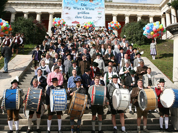 Petrus hat mich und vermutlich noch tausend Andere erhört! Als die Musikanten den Bayrischen Defiliermarsch spielten – verzogen die Wolken und der typisch blau-weiße bayrische Himmel strahlte auf uns nieder- es war wirklich Gänsehautstimmung. Das traditionelle Wiesnplatzkonzert (heuer zum 25. Mal) am Fuße der Bavaria findet demnach im Trockenen statt. Alle Musiker der Festzelte treffen sich alljährlich am 2. Wiesnsonntag  zum weltgrößten Blasmusikkonzert. Wiesn- und Musikbegeisterte sollten sich dieses Highlight nicht entgehen lassen. Ich war wieder einmal schwer begeistert. Danach zog ich mit dem Weinzelttrupp – angeführt von der Familie Kuffler gefolgt von den Sumpfkröten und der Blechblos’n ins Weinzelt ein.