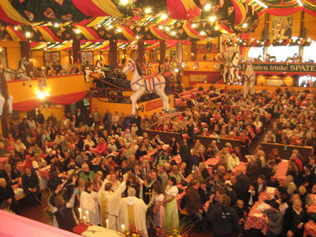 Seit über 50 Jahren wird im Hippodrom am ersten Wiesndonnerstag ein Gottesdienst abgehalten – so auch heute wieder – die Messe wurde diesmal, zur Jubiläumswiesn, vom Erzbischof Agostino Marchetto aus Rom zelebriert. Ich habe diese Tradition die letzten Jahre ausgelassen, aber heute war ich live dabei und es war ein fulminantes Erlebnis für mich.