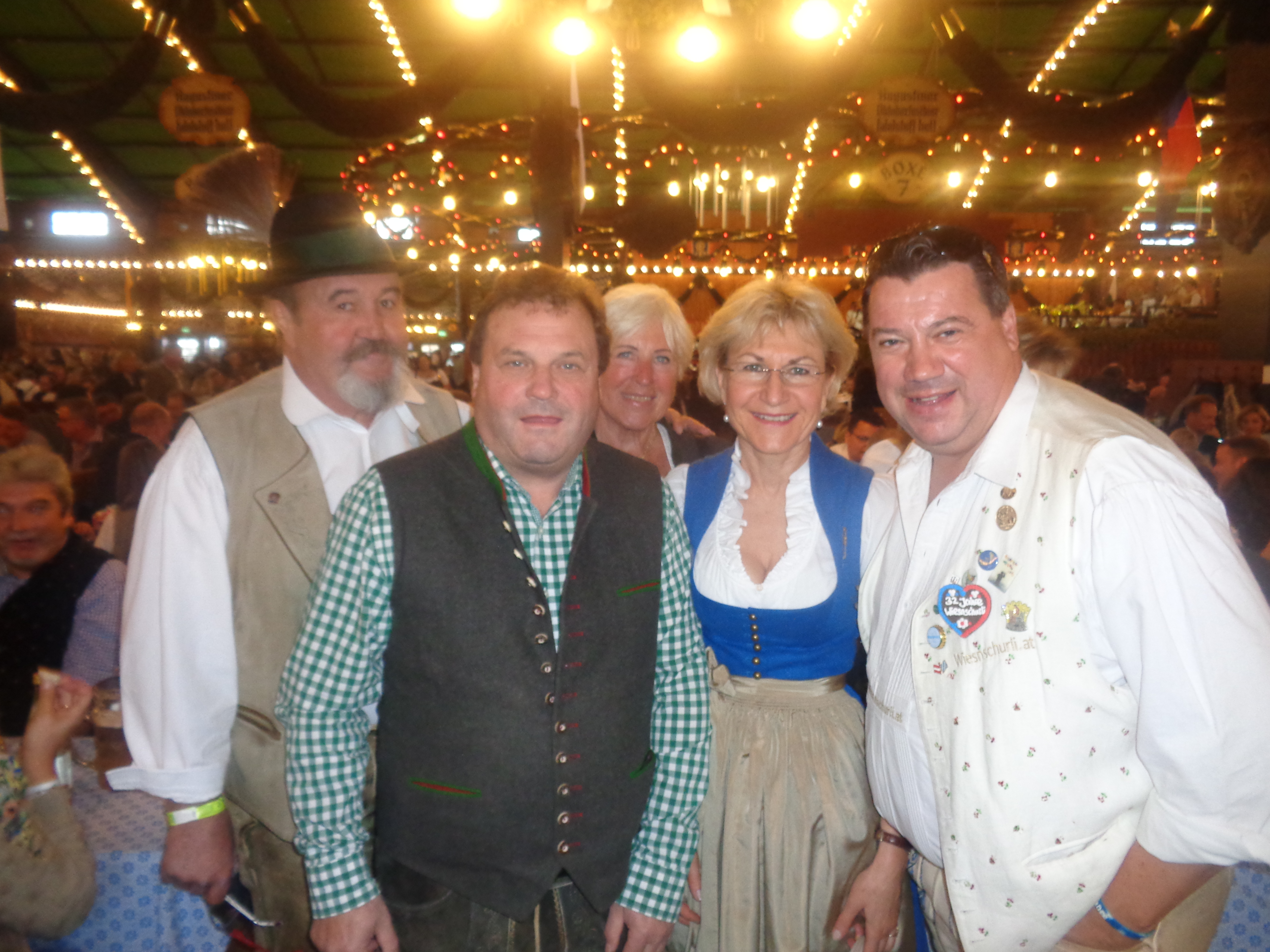 Tja nutzt nix – auch wenn’s regnet muss man pünktlich in der Box7 sein – die Gäste wollen begrüßt werden 🙂 Sehr zu meiner Freude darf ich nach langem Warten endlich auch  Antonia mit ihrer Freundin Eva  bei mir im Paradies begrüßen. Als Willkommensgeschenk überreiche ich beiden den Österreich-Bayrischen Freundschaftspin. Auch die Austrianer unter Markus Schaffer (Spielerbetreuer)  sind wieder angereist – und weil Markus heute seinen Geburtstag feiert – haben seine Freunde organisiert, dass er die Augustiner Band dirigieren darf. Die ganze Hautevolle ( Wiener Wahnsinn, TomX, Dieter & Antonia, Eva, Gerhard Kerschi) wechselt gemeinsam in den HImmel der Bayern (Hackerzelt) , nach einer Maß geht’s weiter zum Käfer in den Garten (überdacht und geheizt) besetzen wir drei Tische und haben trotz der besch….eidenen Wetterlage ein riesen Theater – der Schmäh rennt – der Champagner/Spritzer läuft und alles ist super. Weiter zur Abendreservierung in die Bratwurst. Musikalisch werden wir von den Derbys unterhalten und die bitten gleich unseren Soberl zum Mikrophon um ein paar Lieder gemeinsam zu singen – die Stimmung ist am Höhepunkt!!!