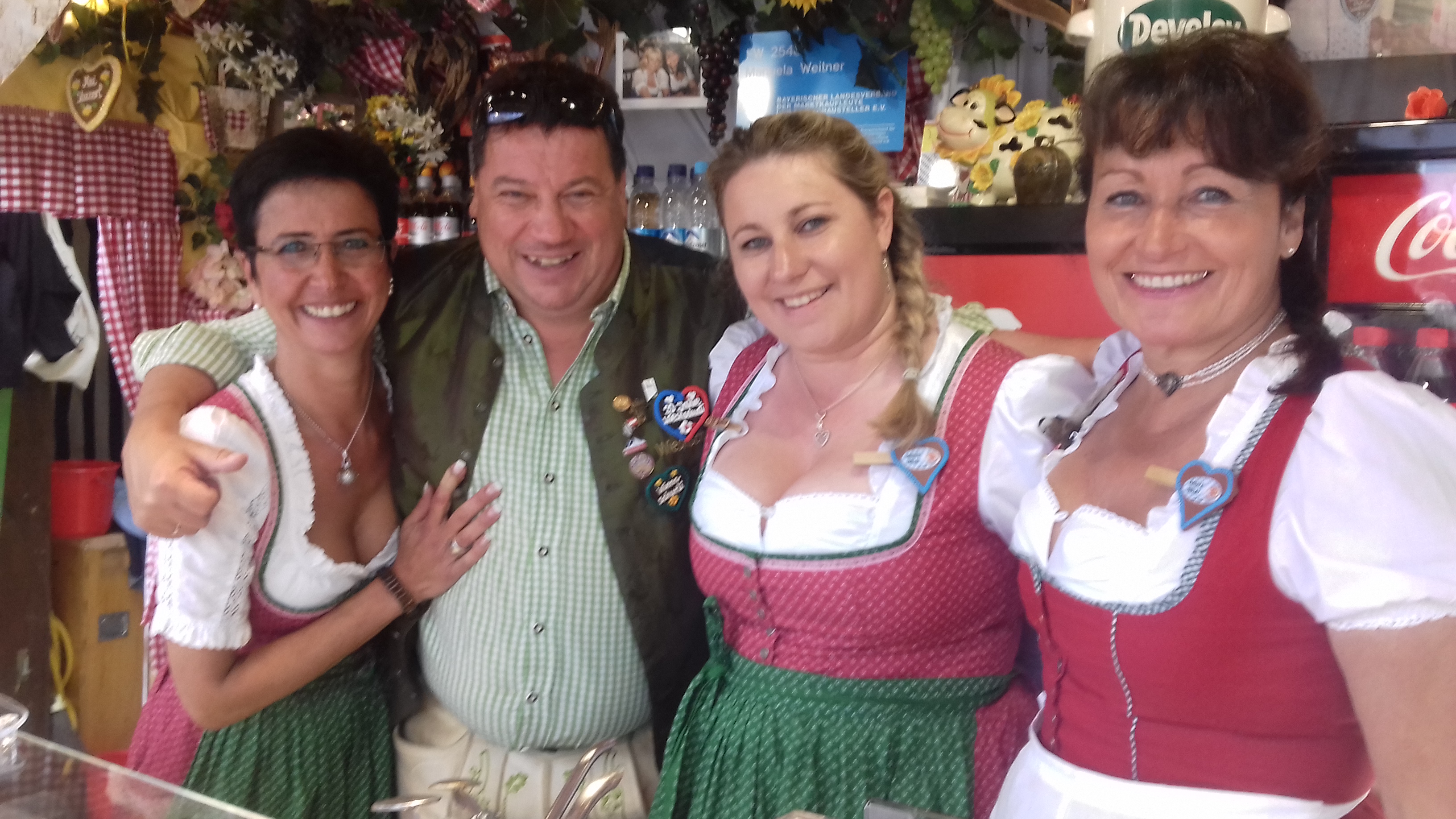 Ein sehr befreiendes Gefühl, das Haus einmal ohne Regenschirm verlassen zu können. Heute heißt es Abschied nehmen, meine WWF (Wiener Wahnsinns Freunde) verlassen das Paradies – aber vorher geben wir noch Gas. Die Illustre Runde wechselt von der Augstiner Festhalle zum Poschner auf ein gepflegtes Mittagessen. Es wird Ente, Blaukraut und Erdäpfelknödel serviert. es mundet allen hervorragend. Dann Wechsel zur Bratwurst wo wir mit Marlene auf ihren heutigen Geburtstag anstoßen. Das Wetter hält und wir können, man mag es kaum glauben: bei Sonnenschein ein paar nette Stunden im Gastgarten feiern. Die Termine sind dicht gedrängt beim Wurstmichel finden wir uns zum  traditonellen Wiesnfoto ein  und dann ab ins Weinzelt. Boardingtime. Als Flugbegleiterinnen sind Marlene und Dani mit an Board. Frtiz Kaufmann mit fünf Kollegen kommt auch auf eine Stipvisite vorbei. In den frühen Abendstunden machen wir noch kurz Party in der Wilderer Bar im Schützenzelt. Dann erfülle ich der Wiesnsekretärin einen Wunsch: sie möchte mit mir im Cafe Kaiserschmarrn einen Spritzer trinken. Ich kannte dieses Zelt bisher eigentlich nur vom Vorbeigehen. Bin aber so überwältigt von der tollen positiven Stimmung, daß ich beschließe im nächsten Jahr hier eine Abendreservierung zu tätigen! —bist deppat da geht die Post ab!