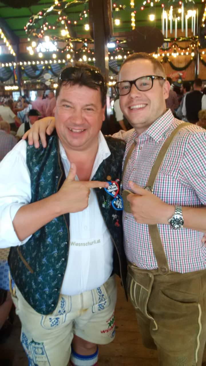 Freudig aufgeregt betrete ich die Box7 – bin gespannt was mich heute erwartet, in meinem Wiesnplan ist Folgendes vermerkt: 13:00 – 18:00 Uhr geblockt, keine Gäste!Gerhard lüftet nun das Geheimnis – er hat ein paar Jungs zusammen getrommelt und eine Mittagsreservierung in der Bratwurst gemacht. Es ist in Worte kaum zufassen – was wir da heute erleben durften. Ganz großes Kino! Ein Fassl 30L Edelstoff – Roland Hefter als musikalisches Highlight und nur liebe Menschen! Danke!!! Bei perfekten Wiesnwetter treffen nun auch Michi Grossauer samt Konsorten im Garten ein um endlich den Wiesnschurli Tisch auf der Wiesn 2016 einzuweihen! Ich habe großes Glück und darf Claudia (Pressesprecherin des Oktoberfestes) kennenlernen.  Ich erhalte von ihr den goldenen Wiesnpin 2016 (sieht aus wie das Wiesnplakat nur nicht bunt sondern Gold) im Gegenzug darf ich ihr den österreich-bayrischen Freundschaftspin überreichen. Ich gönn mir heute auch mal wieder einen Besuch im Teufelsrad, die Lachmuskeln werden wieder ganz schön strapaziert! Ein toller Wiesntag neigt sich im Weinzelt seinem Ende entgegen – ich freu mich auf morgen!