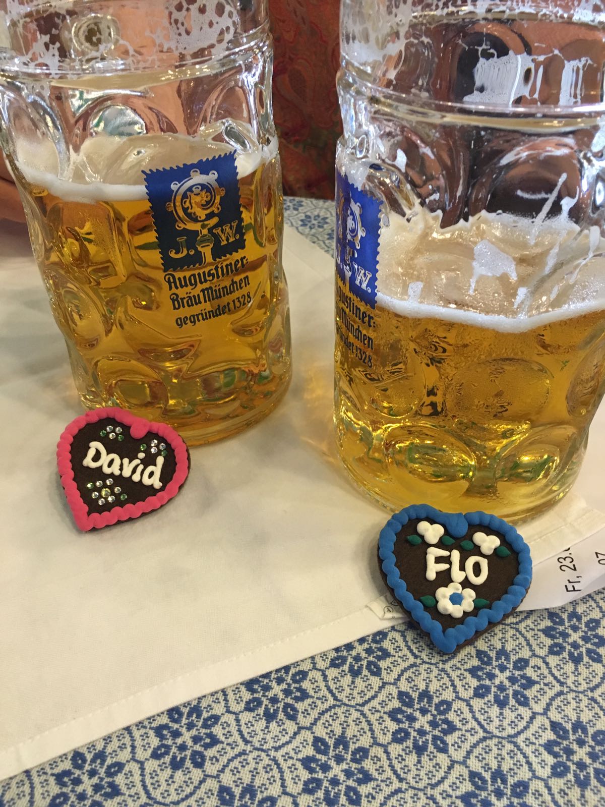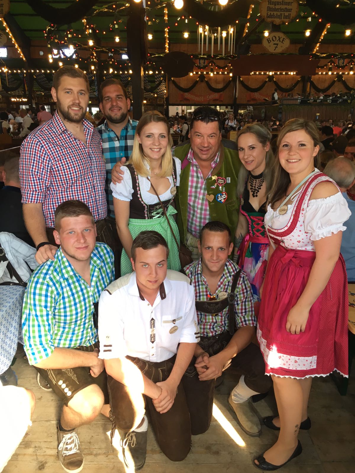 Die Sonne lacht vom Himmel und das Herz vor Freude. Besuch aus der Heimat – mein Wiesnprinz Florian und Freund David, meine Rot Kreuz Kameraden Martin, Wowo und Alex mit Partnerinnen reisen an. Im Augustiner erhalte ich von Bernd und seinen Mödlinger Freunden ein Gastgeschenk – sie haben mir einen Bierkrug machen lassen – vielen Dank nochmals an dieser Stelle. Mittags feiern wir Camillos Geburtstag in der Fischer Vroni mit sensationellem Steckerlfisch und gut gekühltem Augustiner Bier. Das Geburtstags Kind darf auf der Bühne ein Lied dirigieren. Bei perfektem Wiesnwetter verbringen wir den Nachmittag in der Bratwurst und rechtzeitig zum Fliegerlied sind wir traditionsgemäß wieder im Weinzelt. Meine heutigen Flugbegleiterinnen (Svetlana, Martina und Barbara) sind alle Wiesnjungfraun  und genießen die paar Minuten auf der Bühne in vollen Zügen.  Wie jedes Jahr freue mich auch Christian Steiner in der Box 14 zu besuchen um mit ihm und seinen Freunde ein paar fröhliche Wiesnstunden zu verbringen.