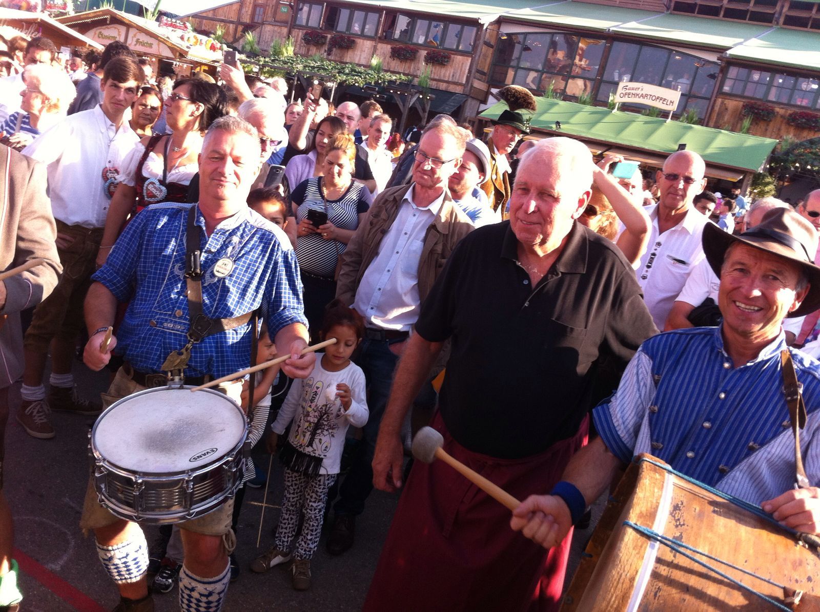 • Der Wiesnplan ist heute ziemlich voll und so auch die Box7 – und das ist gut so. Die Super Truppe ist wieder vereint. Dieter, Walter und Bomel, die Wahnsinnigen von Wien mit Petzi, Martin und dem im Lied besungenen Artur. Die Petaschdorfer, die Schladminger, der Flroian ,die Witti’s und last but not least auch die Wiesnsekretärin. Der Wettergott meint es diesmal leider nicht gut mit uns – deshalb gibt’s Mittagessen in der Box – schmeckt allen hervorragend. Nachmittags im Weinzelt haben meine Freunde der Blechblos’n und ich ganz tolle Unterstützung beim Fliegerlied. Als Co-Pilot darf ich heute Felix (Sohn von Gerhard & Mira) bei mir begrüßen – er hat seine eigene Besatzung mit Mira, Marlene und Ida … schon heben wir gemeinsam ab! Später in der Bratwurst treffe ich Gregor Glanz der das Zelt zum Beben bringt : WOW extrem superStimmung in der Hütte! So läßt es sich feiern! Micha (Bassgitarrist der Münchner Freiheit) widmet mir ihr Lied ‚So lang man Träume noch leben kann‘ – er meint es passt perfekt zu mir – Danke Micha hab’s mir vor dem zu Bett gehen noch angehört!
