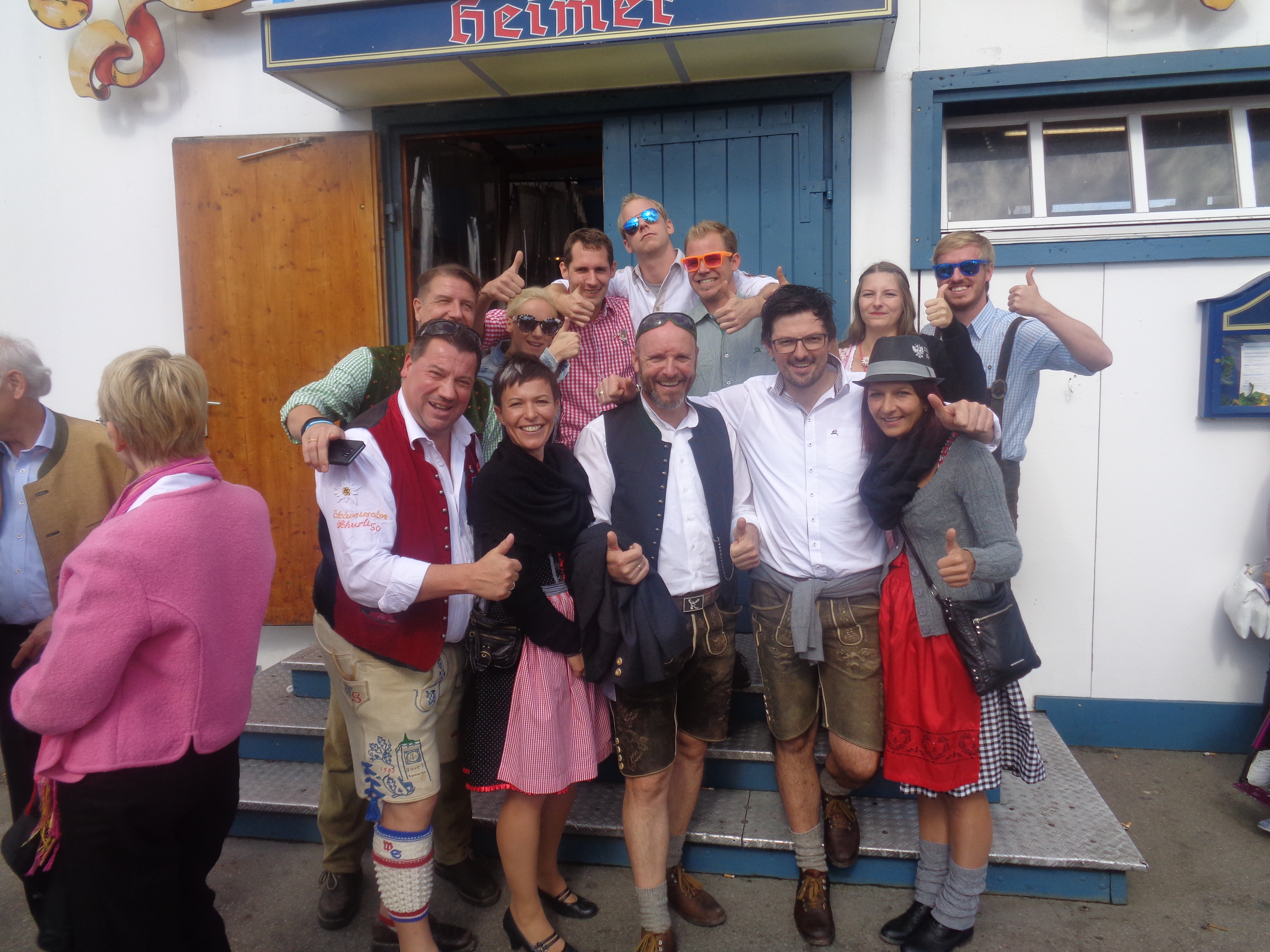 blum moser bodenlegerNachdem wir gestern bei Gerd in der Wechselstube so viel Spaß hatten, lass ich es mir nicht nehmen und bringe ihm gleich in der Früh das Wiesnschurlibuch vorbei. Na der hot a Freid – und möchte unbedingt den Autor also meinen Bruder Thompson kennen lernen. Heuer findet zum 10x unsere lieb gewordene Tradition, Treffen der Bodenleger auf der Wiesn statt. Mit an Board sind Klaus, Stefan, Martina aus Deutschland, Roland und seine Truppe aus Salzburg und Steiermark, Jörg/Schweiz und Thompson und ich ergänzen die Österreicher Quote. Mittags sind wir 35 Personen beim Heimer mit dabei sind nun auch Christian aus Tulln, meine lieben Freunde Reini mit seiner Petra und Lizzy. Nach einem kurzen Verdauungsspaziergang übers Festgelände sind wir um 16:00 Uhr bei unserer Reservierung im Weinzelt. Der Wiesnschurli-Flieger hat heute europäisches Personal aus Österreich, Deutschland und der Schweiz. Gerade Rechtzeitig zum Auftritt sind auch die Doggi’s und Scharf’s aus Klosterneuburg im Zelt. Ich treffe auch Robert mit seiner Frau Karin und Thomas (Krone Sportteil) die sich fürs morgige Bayern-Match aufwärmen.