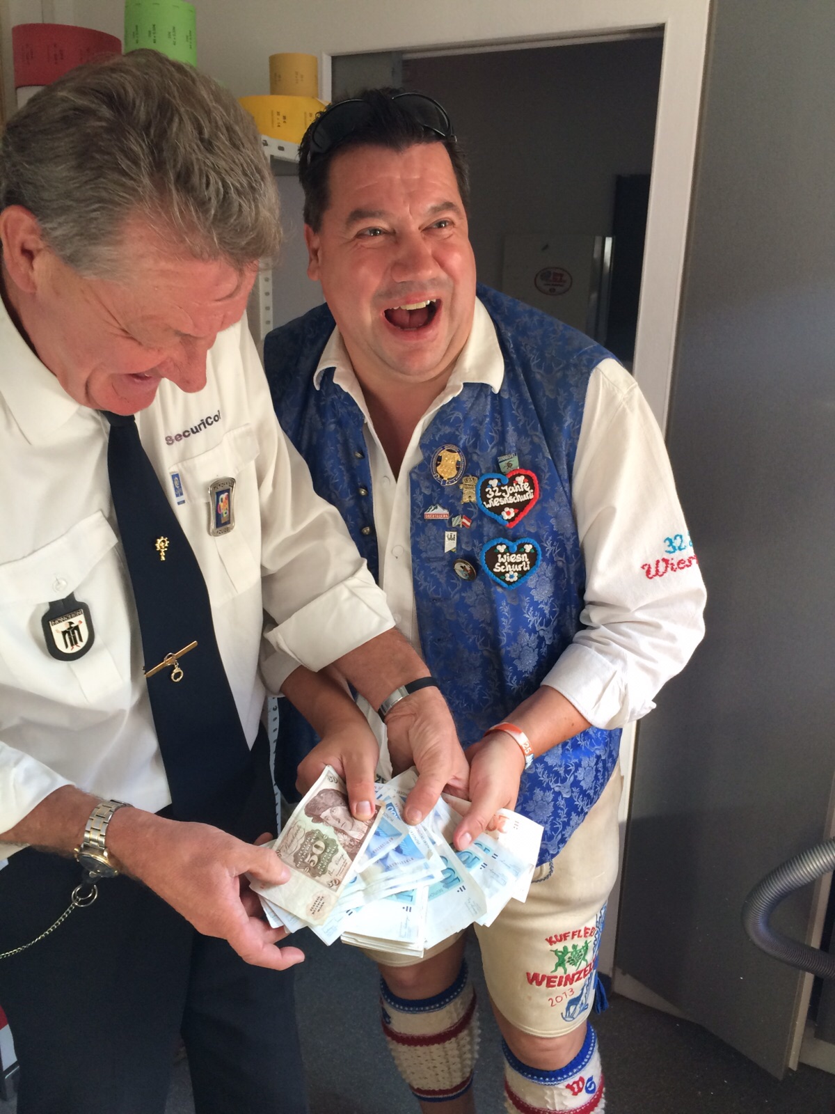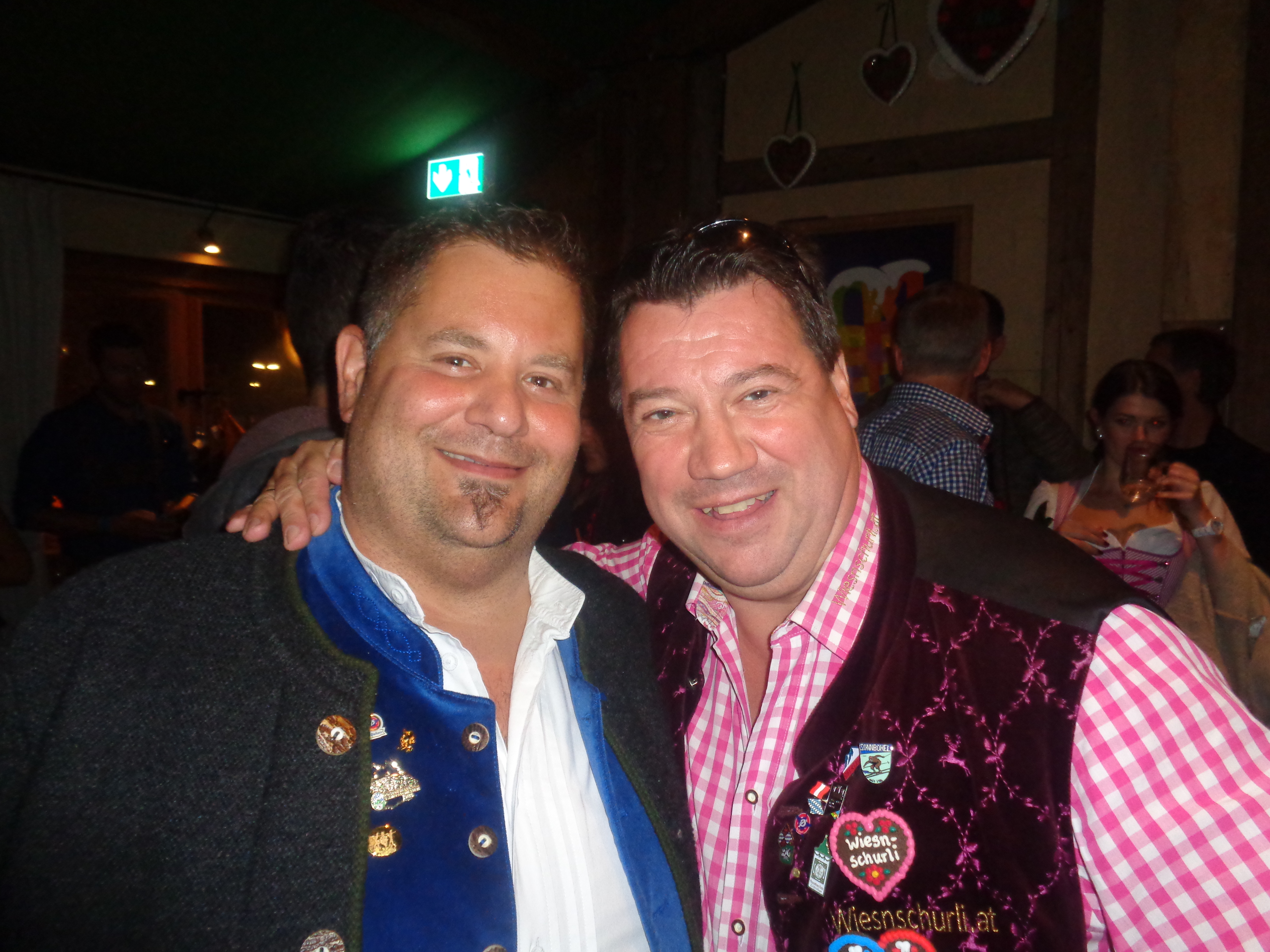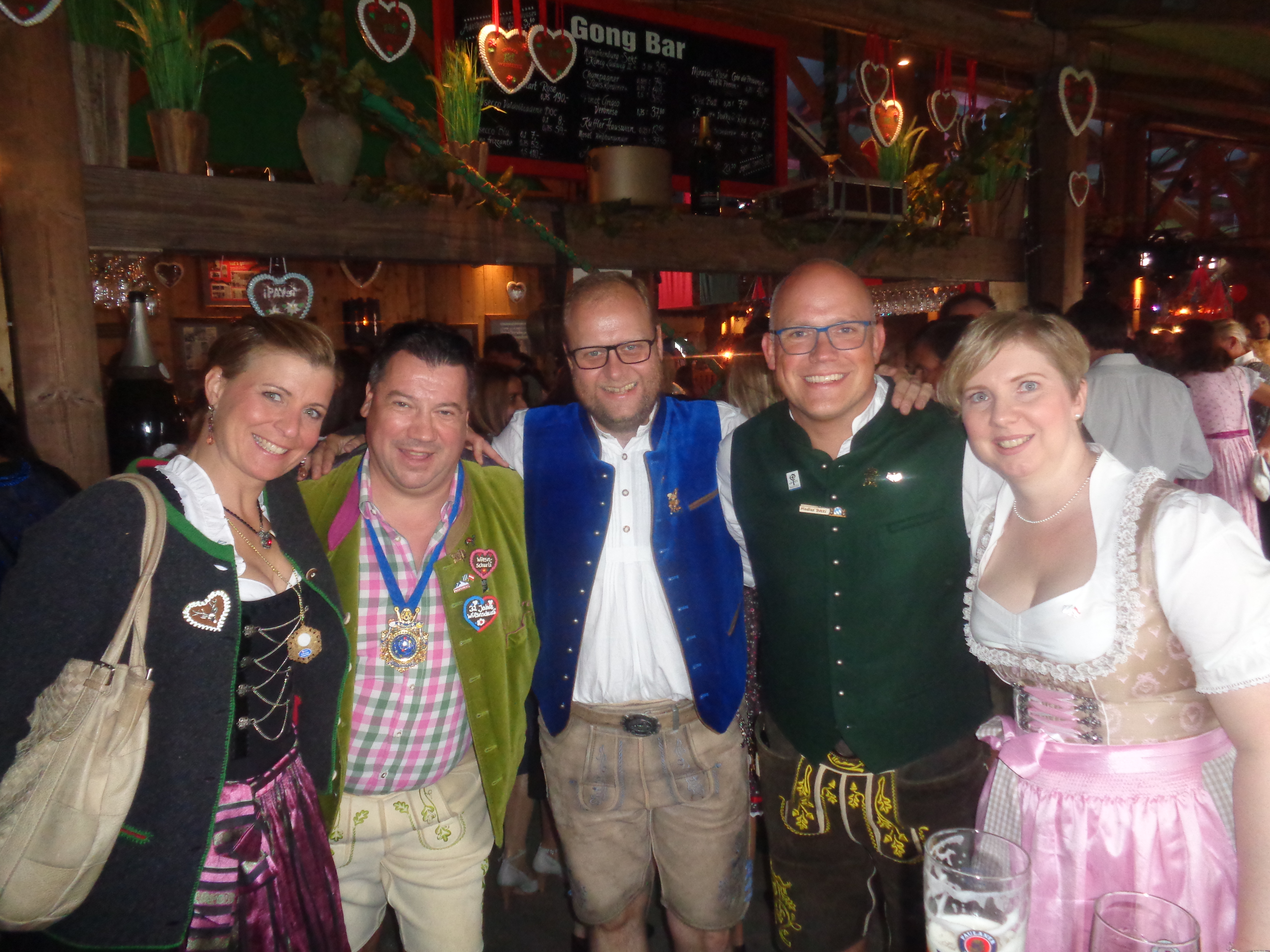 Das Wohnzimmer füllt sich allmählich Reini und Joachim vom FC Bayern München-Fanclub Marchfelder Lederhosen FCB sind wie immer pünktlich – und genauso pünktlich wie wie ein Schweizer Uhrwerk erscheint auch Adrian mit seinen Burschen (Wiederholungstäter aus CH). Als Gastgeschenk hat Adrian für mich eine Geldspange die aussieht wie ein Schweizer Messer mit Wiesnschurli Gravour. Danke lieber Freund. Es kommen auch Bernd/Florian aus Mödling und Kurt aus München – ich kannte die sympathischen Burschen bis dato nicht – aber Bernd hat Florian vier Stunden lang bei der Autofahrt genervt – den Wiesnschurli zu treffen – und sie haben es geschafft – ich steh nun leibhaftig vor ihnen! Klarerweise gibt’s für das liebenswerte Fanouting gleich ein Wiesnschurlibuch mit Widmung. Dem aufmerksamen Blog Leser wird nicht entgangen sein, dass einer meiner heurigen Lieblingsplätze auf dem Gelände die Oide Wiesn ist, und genau dahin gehen wir (die Marchfelder und die Schweizer) nun. Alle sind von dem Kontrast zwischen Vollgasparty (draußen) und Gemütlichkeit und Tradition (drinnen) begeistert. Wir lassen uns das Bier aus den Tonkrügen schmecken und genießen das nostalgische Treiben. Zurück auf dem großen Festgelände trennen sich unsere Wege für kurze Zeit – die Schweizer gehen zurück in die Boxe 7, Reini und Joachim in die Bratwurst und ich ins Weinzelt. Dort treffe ich Gerhard – der heute mit seinen Jugendfreunden einen Wiesntag verbringt und eben wegen der Wiesn kenn ich diese Jungs auch schon so 20/25 Jahre. In der Box nebenan feiert Christian Steiner vom Pichlmayrgut und ich freu mich ihn zu sehen. Ich treff mich mit Adrian und seinen Schweizer Kumpanen beim Bauer’s Ofenkartoffel und dann geht’s in die Bar im Weinzelt. Da es hier schon etwas voll ist – schleust uns Markus der neue Bar-Chef – hinter der Theke durch – da ist dann wieder mehr Platz zum Feiern für uns. Ich freu mich auch, auf ein Wiedersehen in der Radio Gong Bar mit Andal und seine Silvia die kamen um einmal beim 4-Augen-Prinzip mit Kerschi und mir dabei zu sein.